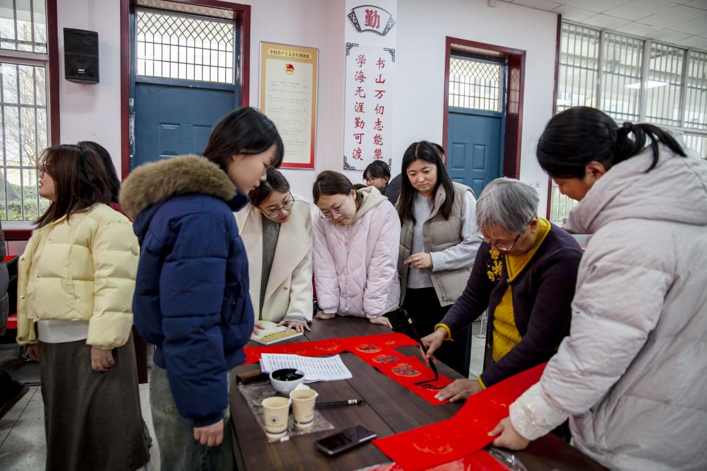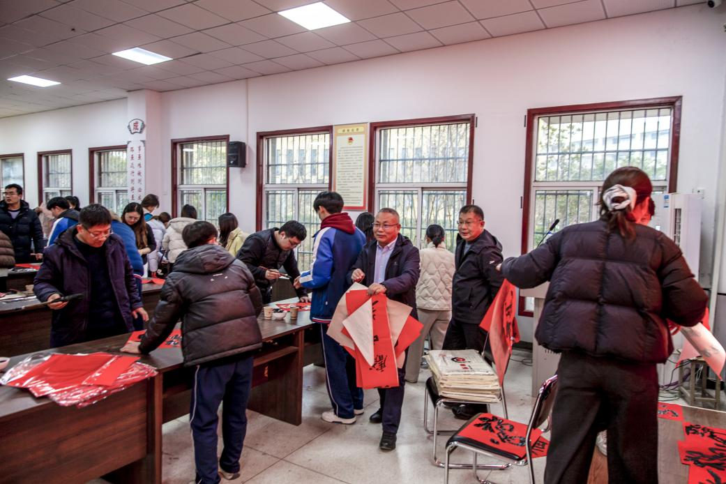 活动现场,红纸铺展,墨香四溢。来自新联会的书法家们挥毫泼墨,笔走龙蛇。一副副寓意吉祥、满载祝愿的春联,一个个苍劲有力、形态各异的“福”字,在他们的笔下流淌而出。这些作品既有对传统书法艺术的精湛呈现,也融合了对新时代美好生活的深情礼赞。教职工们兴致勃勃地围绕在书法家身旁,或欣赏品评,或选定心仪联句,现场气氛热烈而温馨。短短时间内,书法家们倾情书写了300余幅春联和400多个“福”字,将浓浓的关怀与新春的喜庆提前送到了师生们手中,受到了大家的热烈欢迎和一致好评。