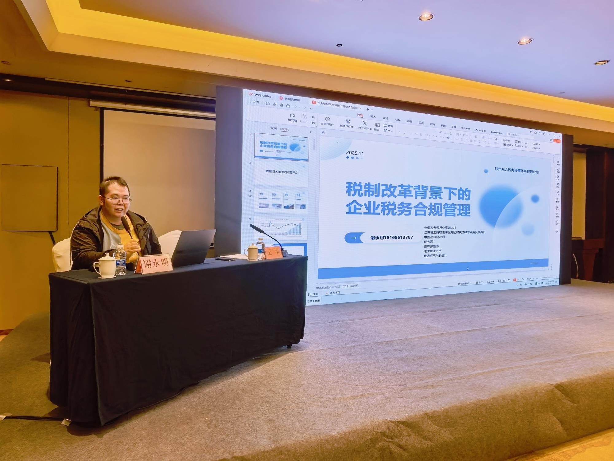 11月22日下午, 民建徐州市委会在徐州开元名都大酒店会议室举办“润企护航”专题培训会。本次培训聚焦企业关切的投资战略与税务合规议题,为会员企业应对复杂经济环境、实现可持续发展提供专业指导。民建江苏省委会副主委、徐州市副市长、民建徐州市委会主委林斌,民建徐州市委会副主委戴道路出席会议。会议由民建徐州市委会委员、企业委员会主任王军主持。
